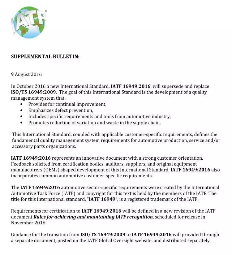 2016年10月,一项新的国际标准 IATF16949:2016 即将生效并取代原有旧标准 ISO/TS 16949:2009。此项新标准的发布在于发展质量管理体系,将致力于持续改进、强调缺陷预防、涵盖汽车行业的特定要求和辅助工具、和在整个供应链中减少变差和浪费。
